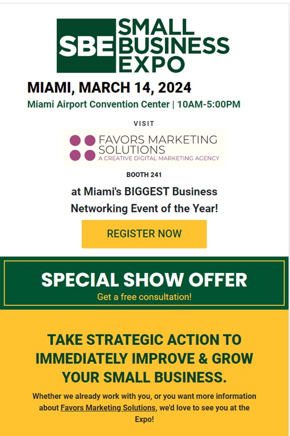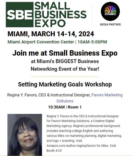 Favors Marketing Solutions (FMS), a digital creative marketing agency, will exhibit and conduct a workshop titled Setting Marketing Goals at the Small Business Expo 2024 in both Miami, FL and Atlanta, GA.